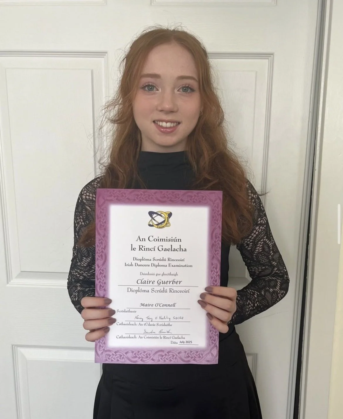 dancers on completing her Grade 12 Exam with an At and being awarded the Dioplóma Scrúdú Rinceoirí from An Coimisiún le Rincí Gaelacha!