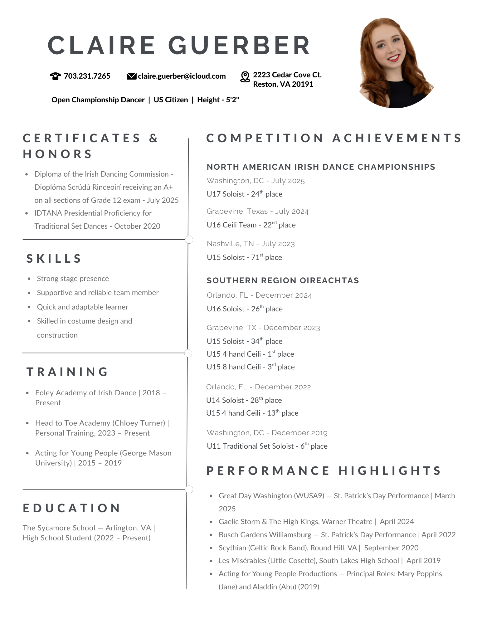 July 2025 - Passed 12 grade exams and earned Dioplóma Scrúdú Rinceoirí (Diploma of the Irish Dancing Commission) with an A+