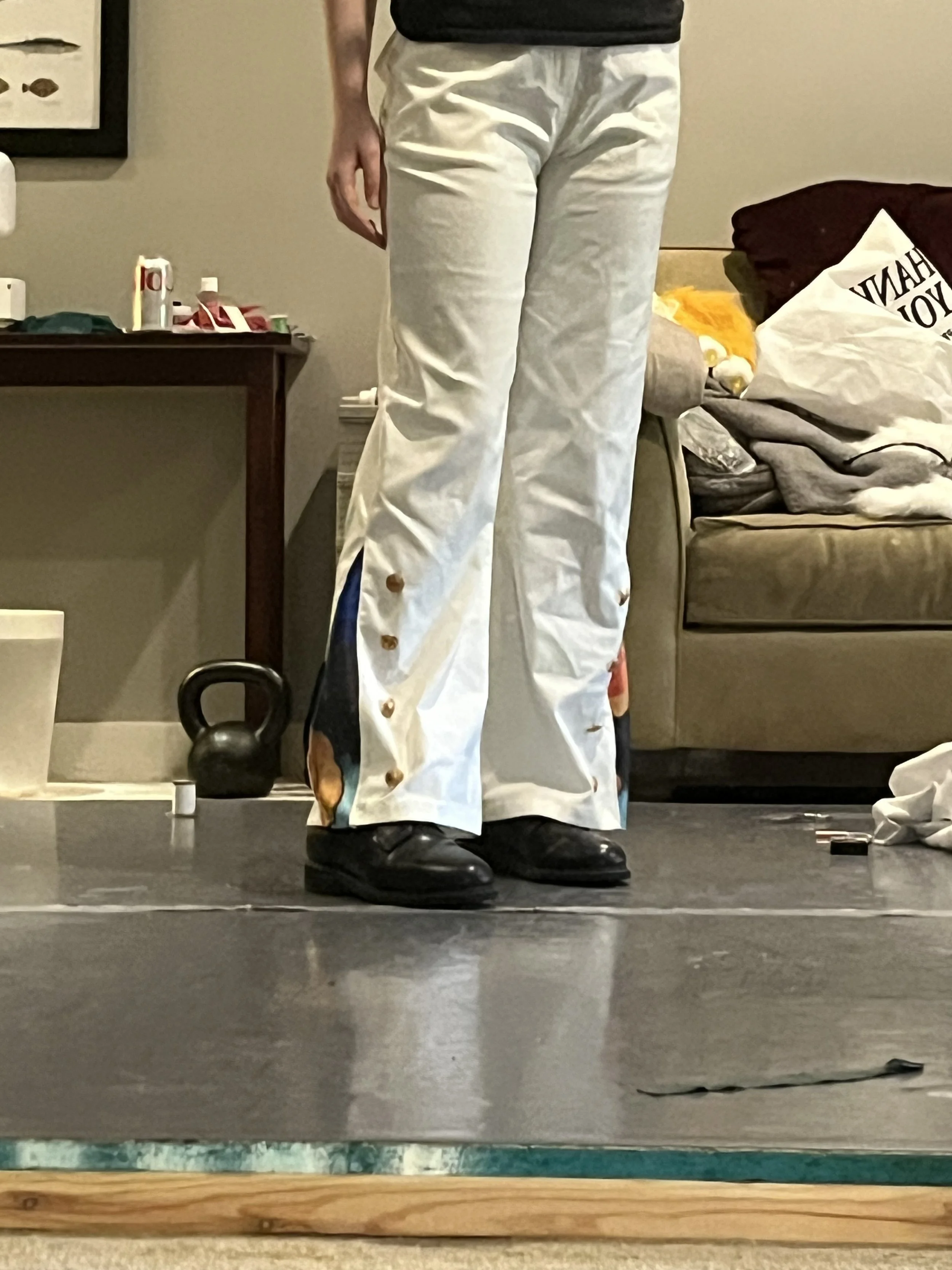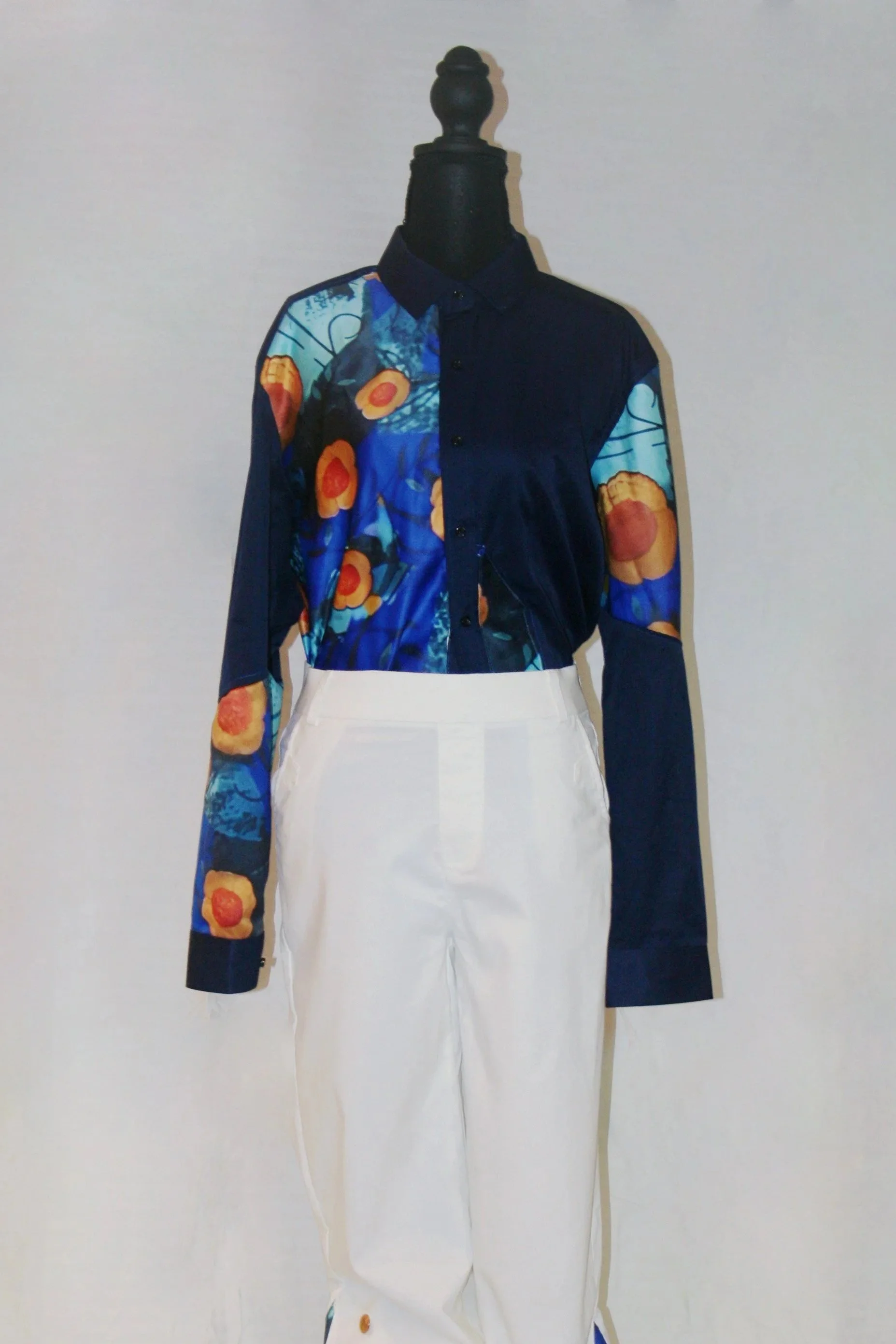 I was inspired to create this outfit for multiple reasons- I loved the colorful and contrasting blue/yellow pattern, the flattering silhouette from a cinched waistline and flared pants, and the overall chill, city-pop aesthetic.